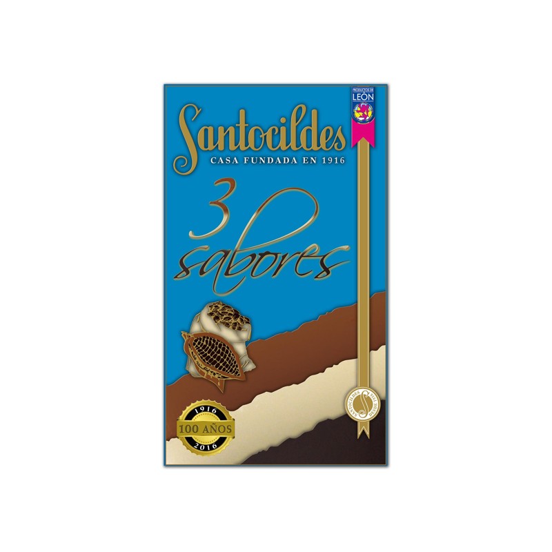 Chocolate tres Sabores de 200grs. Una capa de chocolate puro, una capa de chocolate con leche y una capa de chocolate blanco.
